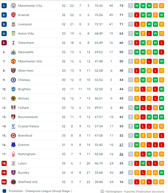 Kurse lideri më i ri në Premier League është Mancehster City që ka 73 pikë kur kanë mbetur edhe gjashtë ndeshje për këto tri skuadra deri në fund./Arbresh.info/