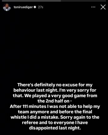 Mbrojtësi i Real Madridit, Antonio Rudiger, u përjashtua me karton të kuq në fund të ndeshjes me Barcelonën në finale të Kupës së Mbretit, ku tani ka kërkuar falje për sjelljen e tij.