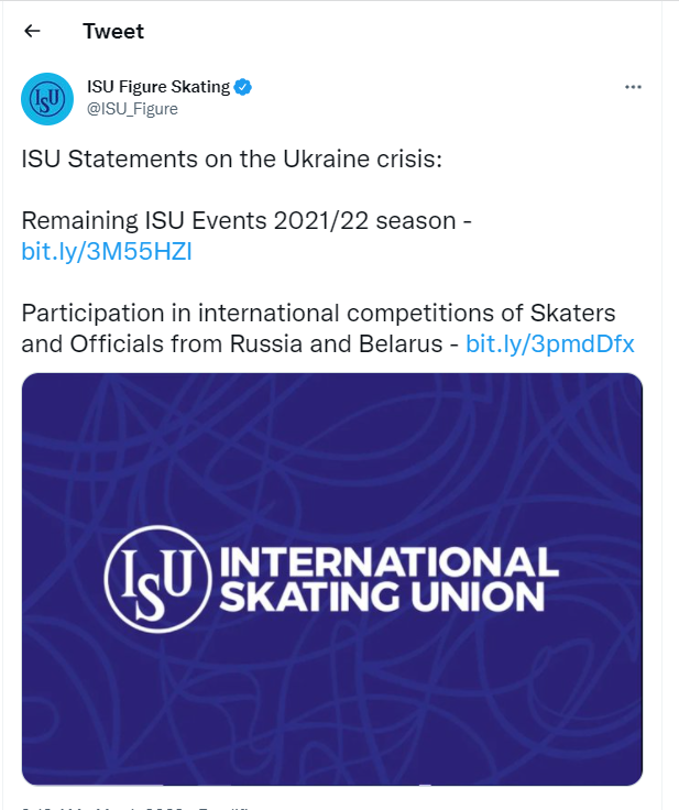 “Këshilli ISU ripohon solidaritetin e tij të plotë me anëtarët e ISU-së në Ukrainë, Federatën Ukrainase të Patinazhit të Shpejtë dhe Federatën Ukrainase të patinazhit artistik. Këshilli i ISU do të vlerësojë mundësitë për ndihmë të shpejtë humanitare për anëtarët e tij ukrainas të ISU”.