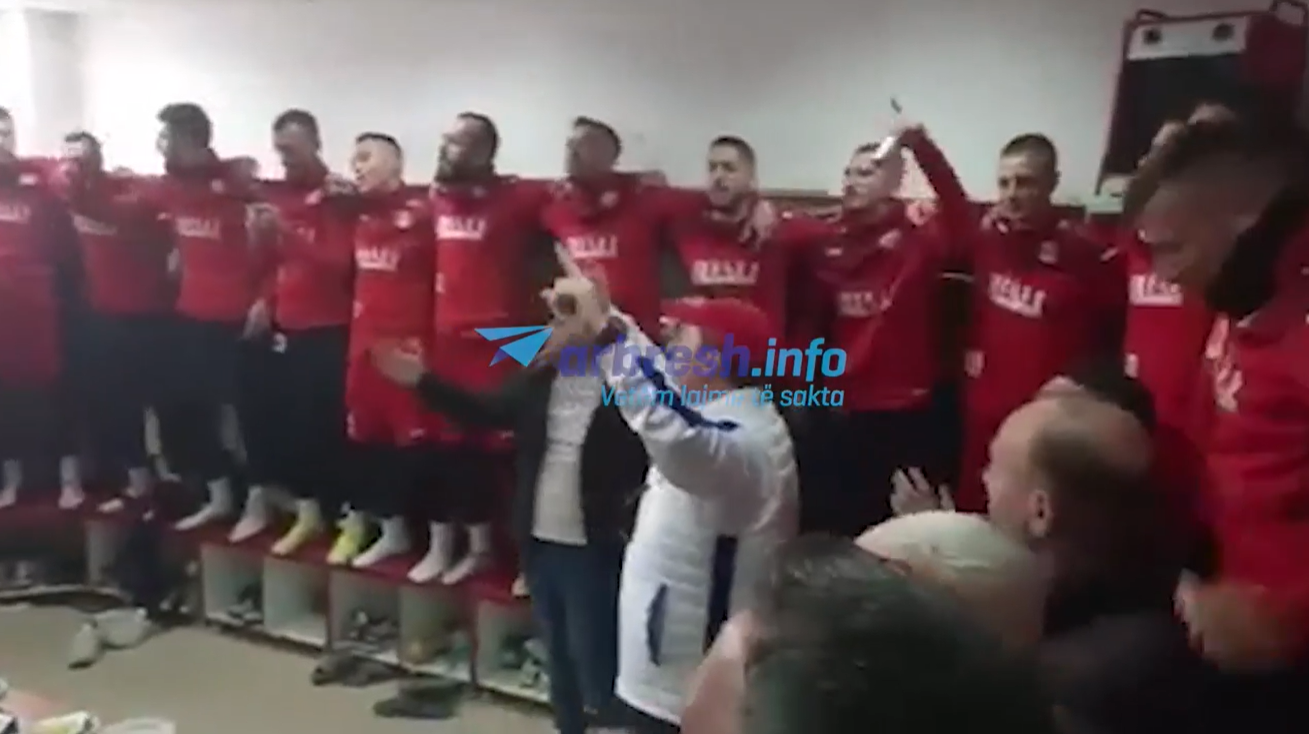 Në video, së bashku me lojtarët, shihet edhe Ismet Munishi duke kënduar me emocione të mëdha./Arbresh.info