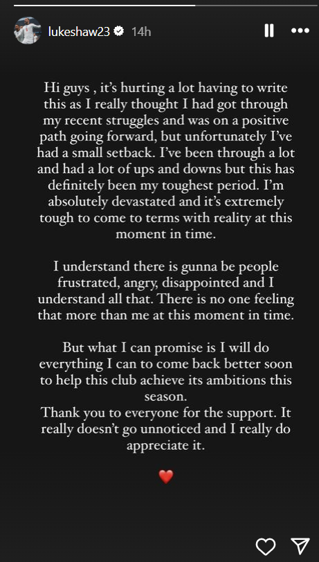 “Ajo që mund të premtoj është se do të bëj gjithçka që mundem për t’u rikthyer më i fortë dhe për ta ndihmuar këtë klub të arrijë objektivat e tij këtë sezon. Faleminderit të gjithëve për mbështetjen. Ndihma juaj nuk ka kaluar pa u vënë re nga unë dhe e vlerësoj”, e mbylli Luke Shaw.