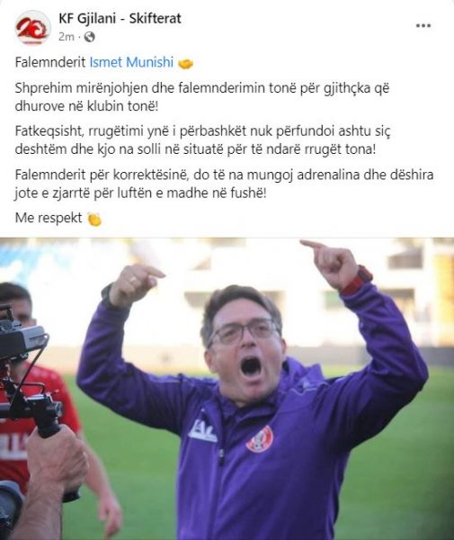Trajneri i njohur kosovar, Ismet Munishi i ndau rrugët sot me klubin e deritashëm pas humbjes nga Dukagjini, 0:2, me ç’rast gjilanasit mbetën thuajse jashtë garës për titull të kampionit pasi janë 9 pikë prapa liderit Ballkani, gjashtë xhiro pa përfunduar sezoni në Superligë.