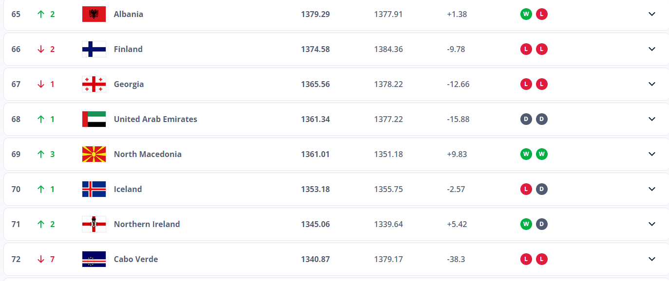 Nga vendi 67 tani Shqipëria renditet në vendin e 65, pas suksesit në ndeshjen e fundit në transfertë ndaj Gjeorgjisë, e vlefshme për UEFA Nations League.