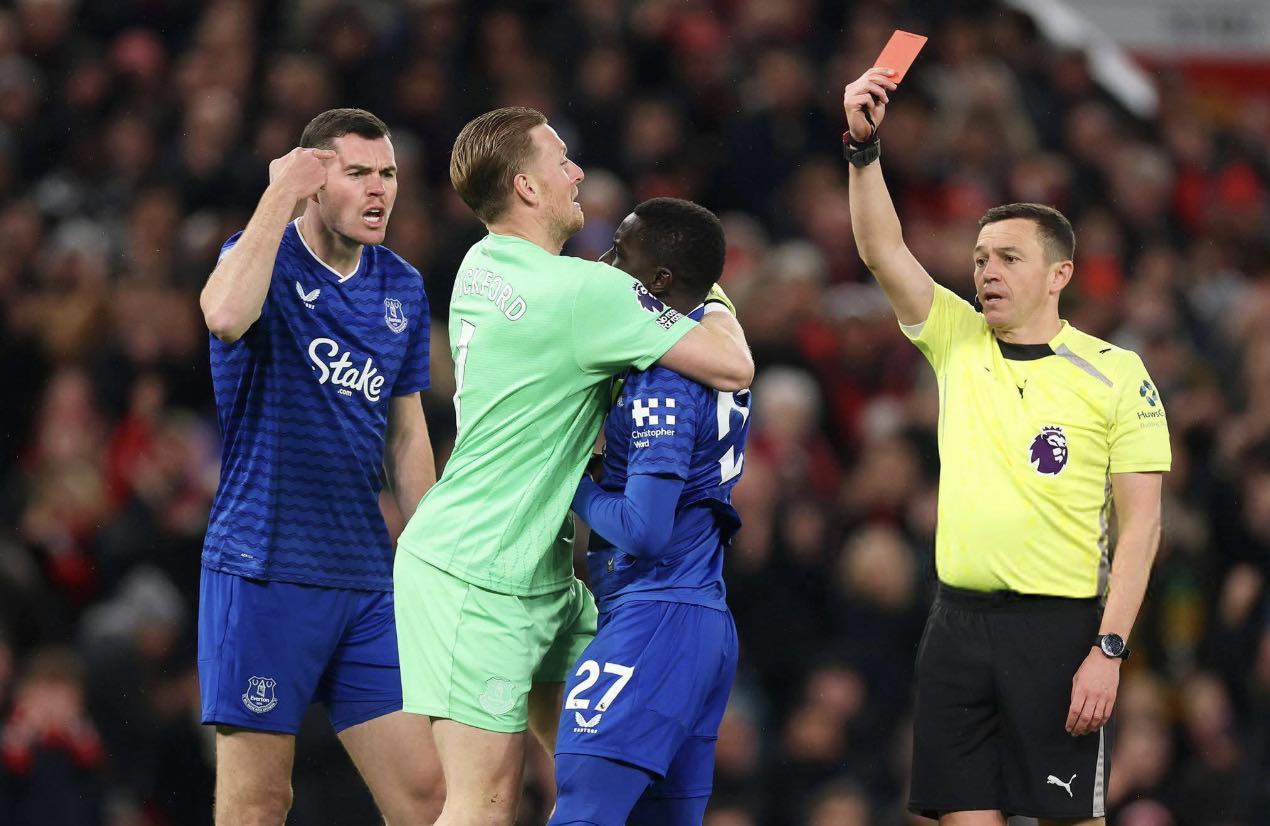 Idrissa Gueye u përjashtua me karton të kuq në ndeshjen Manhcester United – Everton pasi e goditi me shuplakë bashkëlojtarin e tij, Michael Keane.