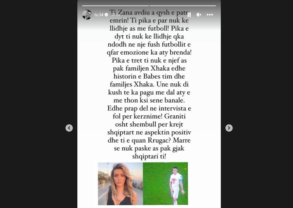 “Ti Zana Avdiu a qysh e pate emrin! Ti pika e parë nuk ke lidhje as me futboll! Pika e dytë ti nuk ke lidhje çka ndodh në një fushë futbollit e çfarë emocione ka aty brenda! Pika e tretë ti nuk e njeh aspak familjen Xhaka edhe historinë e babait tim dhe familjes Xhaka. Unë nuk di kush të ka paguar me dal aty e me thonë kësi sene banale. Edhe prapë del në intervista e fol për kërcënime! Granit është shembull për krejt shqiptarët në aspektin pozitiv dhe ti e quan rrugaç? Marre se nuk paske aspak gjak shqiptari ti!” shkroi Taulant Xhaka në Instagram.