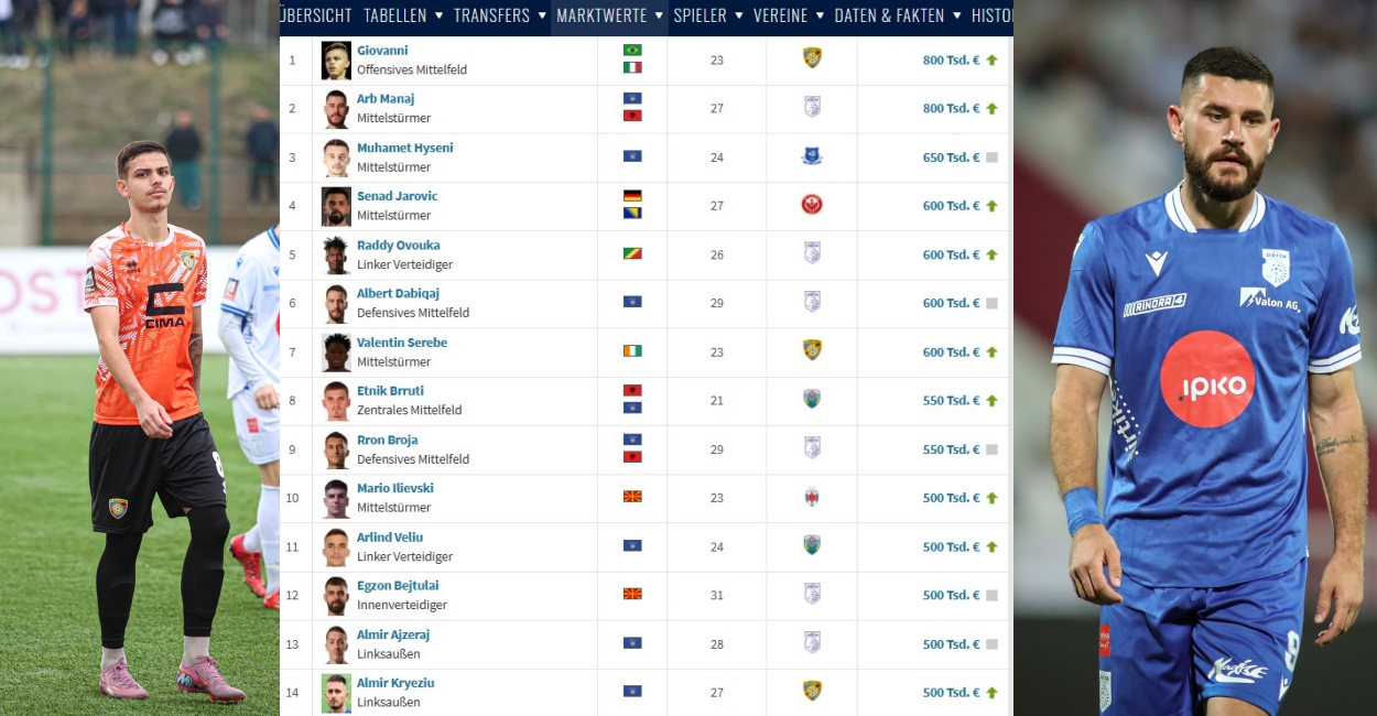 Lojtari më i mirë i vitit i zgjedhur nga Federata e Futbollit të Kosovës, Arb Manaj, dhe ylli i Ballkanit, Giovanni janë lojtarët më të vlefshëm në Superligën e Kosovës, sipas Transfermarkt, shkruan Arbresh.info.