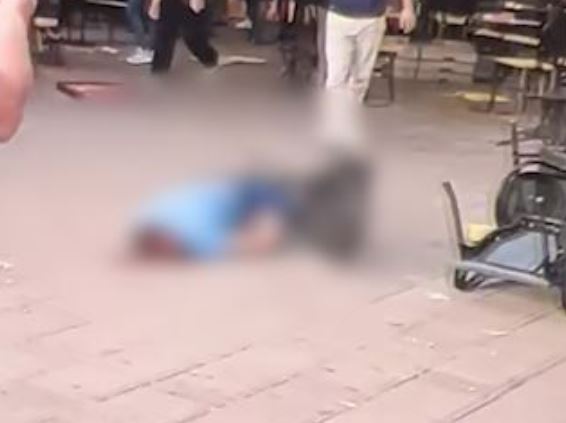 Siç duket dhe nga pamjet i plagosuri ndodhet i shtrirë në trotuar, i pamundur të ngrihet në këmbë dhe i mbuluar me gjak në pjesën e fytyrës.
