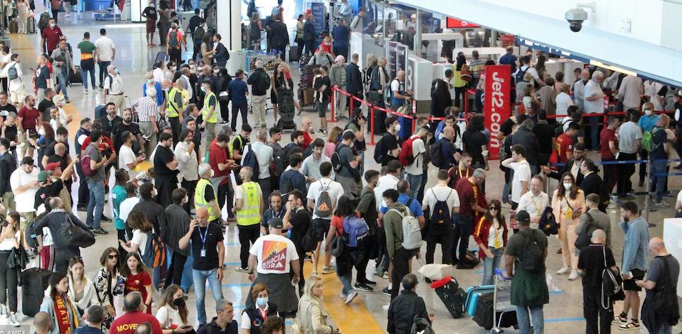 Në zonën e kontrollit të Terminalit 1 dhe 3 në Fiumicini, ultrasit e Romës, që mbajnë veshur fanellat me emrat e yjeve të skuadrës së zemrës (Abraham, Zaniolo. Pellegrini apo De Rossi dhe Totti) këndojnë në kor.
