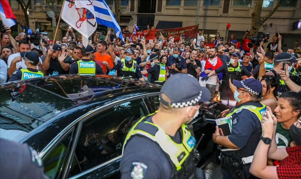 Tifozë serbë që po protestonin në Australi në mbështetje të Novak Djokovicit gjatë seancës gjyqësore, e cila mori vendim në favor të tenistit serb karshi autoriteteve australiane që ia kishin refuzuar vizën 34-vjeçarit për pjesëmarrje në Australia Open sepse ai nuk ishte i vaksinuar kundër Covid, kanë shkaktuar trazira në rrugë.