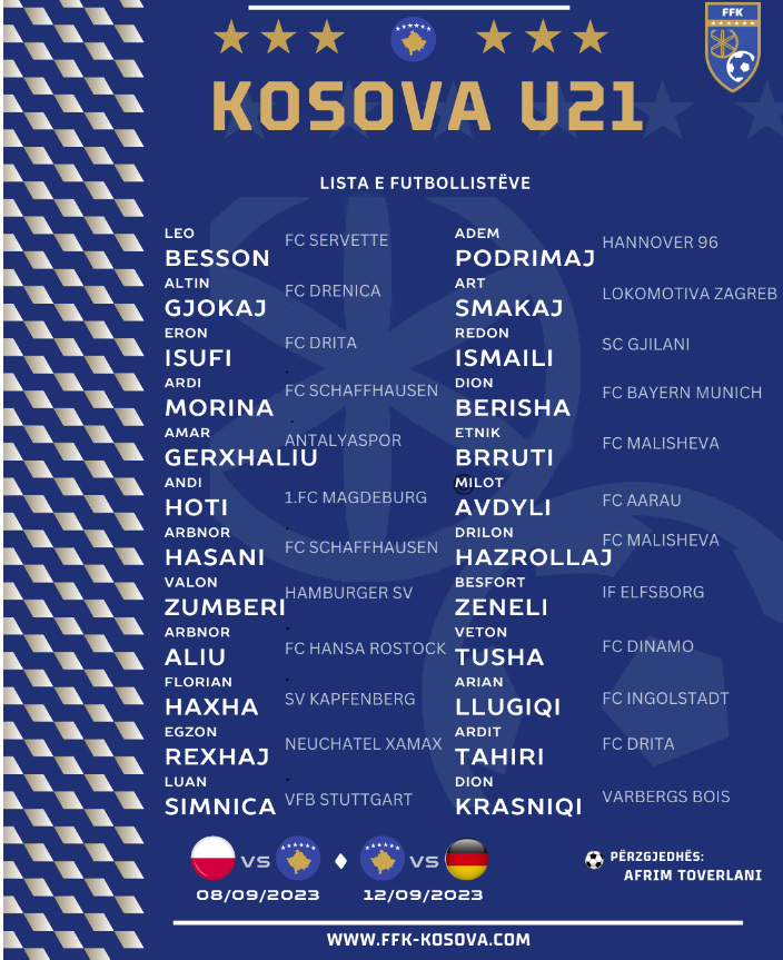 Fillimisht të përzgjedhurit e Tovërlanit do të ballafaqohen me Poloninë më 8 shtator si mysafirë, kurse më 12 shtator do të jenë mikpritës të Gjermanisë, në stadiumin “Fadil Vokrri”.