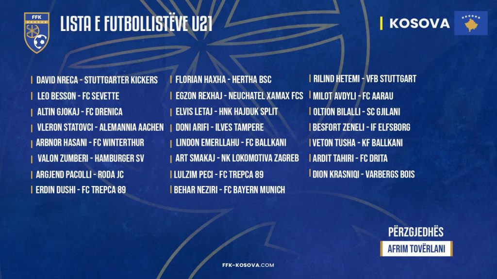 Pjesë e listës ishin edhe futbollisti i FC Freiburg, Andi Hoti dhe futbollisti i Malishevës, Drilon Hazrollaj, por ata kësja radhe nuk do të mund të jenë në dispozicion për shkak të lëndimeve. Kombëtarja e Kosovës U21 është e përfshirë në Grupin D për kualifikimet e Evropianit 2025, ku bëjnë pjesë edhe Gjermania, Polonia, Izraeli, Bullgaria dhe Estonia.