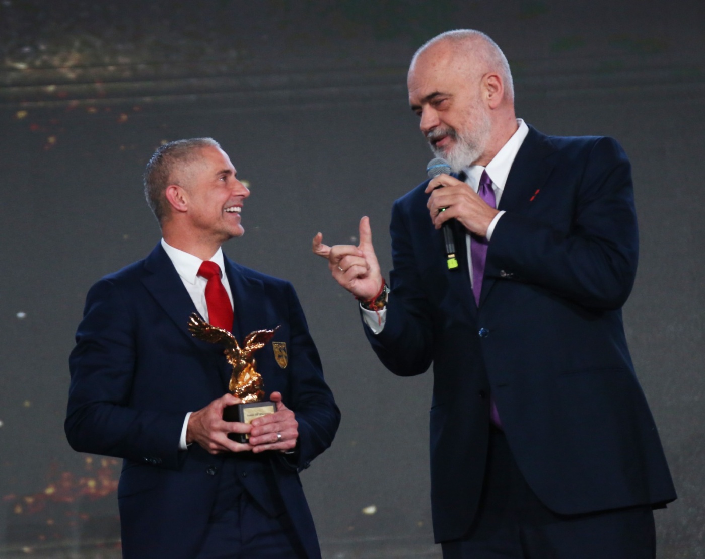 Ishte Kryeministri i Shqipërisë, Edi Rama ai që e ftoi në skenë trajnerin Silvinjo së bashku me ndihmësit e tij Doriva, Hamdi Salihi si edhe drejtorin e Ekipeve Kombëtare në FSHF, Dritan Babamusta, duke i dorëzuar çmimin mes batutave.