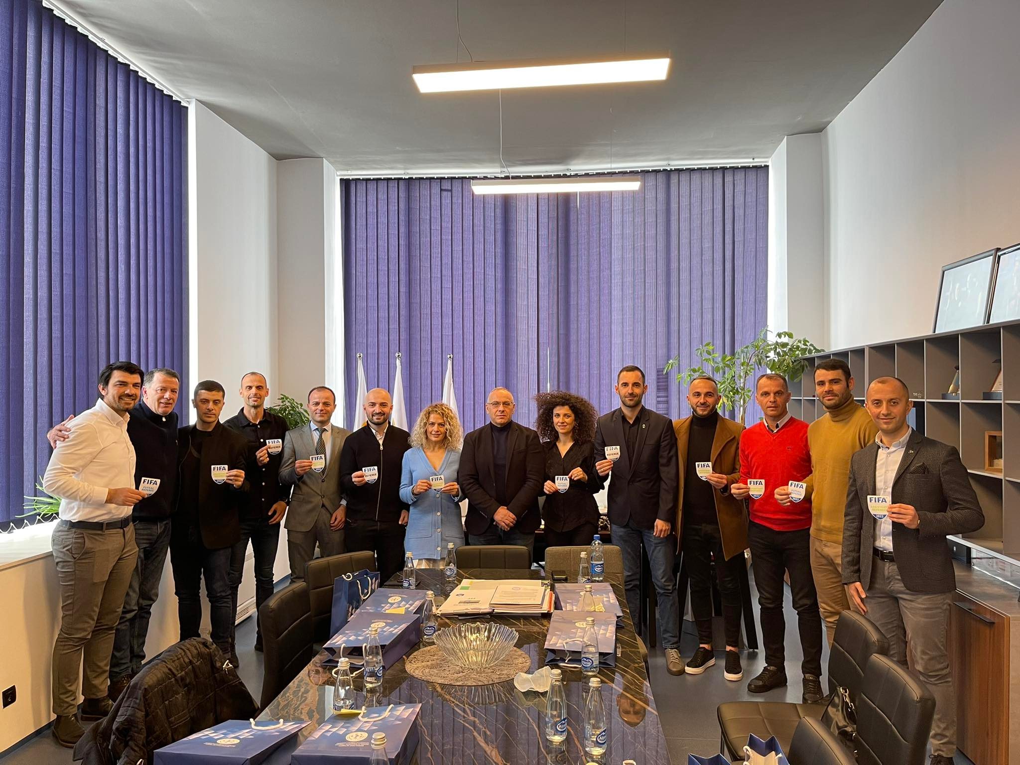 Presidenti Agim Ademi dhe kryetari i Komisionit të Gjyqtarëve, Përparim Hasani, sot kanë dorëzuar stemat e reja të FIFA-s për 13 gjyqtarë, në mesin e tyre edhe dy femra, Lumnije Muhadri dhe Florentina Kallaba.