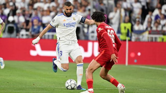 PARIS, FRANCE - MAY 28: Karim Benzema (L) of Real Madrid in action against Trent Alexander-Arnold (66) of Liverpool FC during UEFA Champions League final match between Liverpool FC and Real Madrid at Stade de France in Saint-Denis, north of Paris, France on May 28, 2022. (Photo by Mustafa Yalcin/Anadolu Agency via Getty Images)