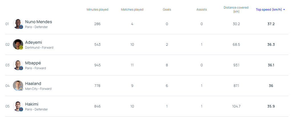 Në krye të listës qëndron Nuno Mendes, mbrojtësi i shpejtë i Paris Saint-Germainit, i cili ka arritur një shpejtësi maksimale prej 37.2 km/h – një performancë impresive në fushë.