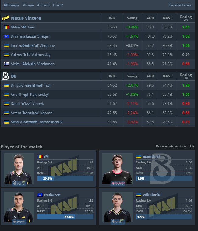 Në “Dust 2”, i jashtëzakonshëm ishte ylli shqiptar “Makazze” ku i vetëm e fitoi këtë map, duke arritur 26 eliminime. Në fund Na’Vi triumfoi 13:7 për të vazhduar tutje.
