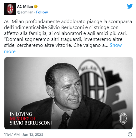 “AC Milan, thellësisht i pikëlluar, vajton për ndarjen nga jeta të të paharruarit Silvio Berlusconi dhe përqafon ngrohtësisht familjen, bashkëpunëtorët dhe miqtë e tij më të ngushtë”.