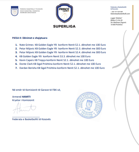 Shkaku i gabimeve teknike, me nga 100 euro gjobë u dënuan edhe Donte Clark e Dardan Berisha nga Sigal Prishtina, si dhe Kevin Capers nga Trepça.