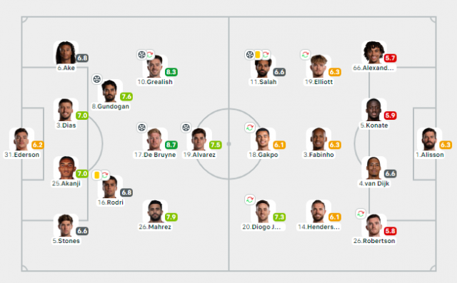 Lojtari me paraqitjen më të dobët ishte Trent Alexander Arnold që u vlerësua me notën 5.7, kurse te City Stones kishte vetëm notën 6.6.