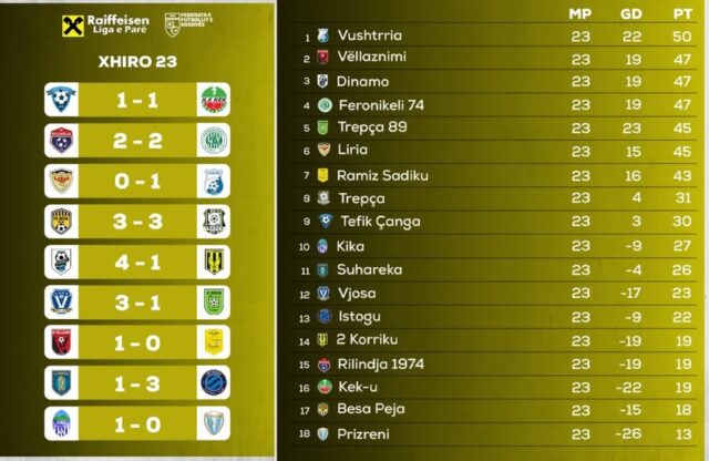 Kanë përfunduar të gjitha ndeshjet e xhiros së 23-të në Ligën e Parë të Kosovës, ku Vushtrria e ka fituar derbin e javës ndaj Lirisë.