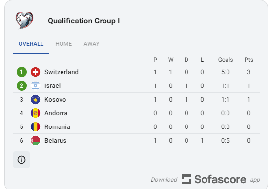 Me këtë fitore, Zvicra është e para në grup me 3 pikë, dy më shumë se Kosova dhe Izraeli që kanë nga një pikë.