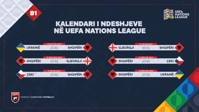Shqipëria njohu pasditen e së enjtes kundërshtarët që do të ketë përballë në grupin B1 të UEFA Nations League. Kuqezinjtë do të përballen me Çekinë, Ukrainën dhe Gjeorgjinë, teksa UEFA ka publikuar edhe kalendarin e plotë të Shqipërisë në këtë kompeticion.