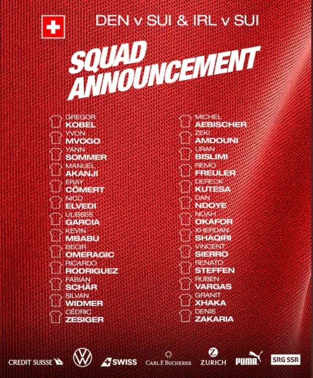 Kombëtarja e Zvicrës ka publikuar listën e lojtarëve për dy miqësoret që do t’i luaj gjatë muajit mars.