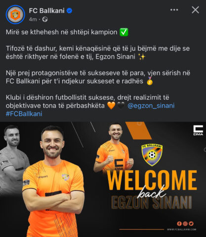 Lajmin e ka bërë të ditur vetë skuadra suharekase përmes një postimi në rrjetin social Facebook, shkruan Arbresh.info.