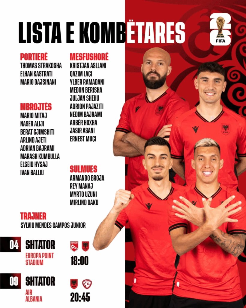 Trajneri Sylvinho ka shpallur formacionin zyrtar për dy ndeshjet e kombëtares shqiptare këtë shtator: një miqësore me Gjibraltar më 4 shtator dhe një për kualifikim për Botërorin 2026 kundër Letonisë më 9 shtator në “Air Albania”.