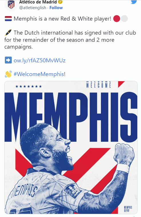 Është vet faqja zyrtare e Atleticos, e cila ka konfirmuar arritjen e marrëveshjes dhe ka zyrtarizuar Depayn si lojtar të ri të tyre.