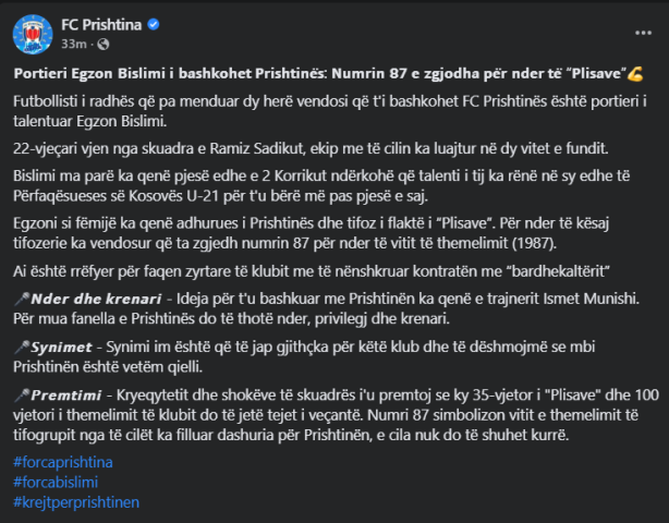“Futbollisti i radhës që pa menduar dy herë vendosi që t’i bashkohet FC Prishtinës është portieri i talentuar Egzon Bislimi.22-vjeçari vjen nga skuadra e Ramiz Sadikut, ekip me të cilin ka luajtur në dy vitet e fundit”, thuhet në njoftim./arbresh.info/