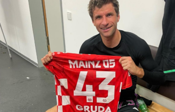 Thomas Muller pozon me fanellën e sulmuesit shqiptar Brajan Gruda që luan te Mainz