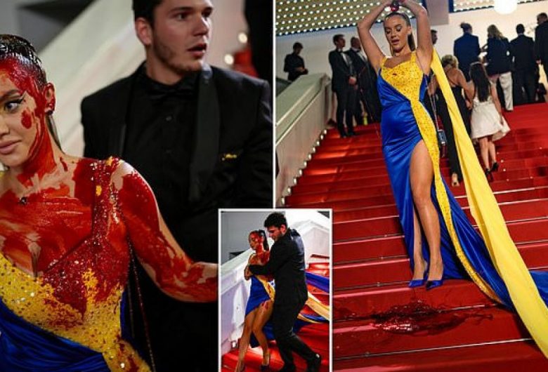 E veshur me ngjyrat e flamurit të Ukrainës – një grua shfaqet e lyer me ‘gjak’ në Festivalin e Filmit në Kanë