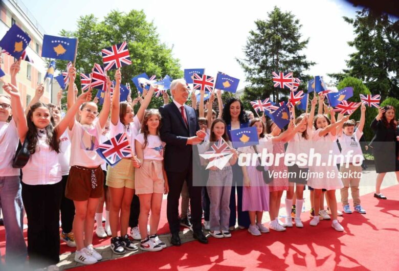 Tony Blair pritet nga fëmijët në oborrin e Kuvendit