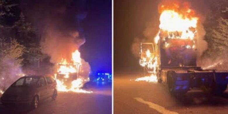 1764919596 - Shpërthen në flakë një kamion në autostradën e Stuttgartit, rrezikoi pyllin dhe automjetet