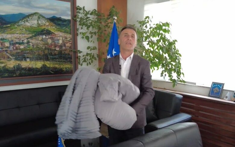 Me çebe e jastëk në dorë, Lulzim Hetemi demonstron se si fjeti shtatë muaj brenda Komunës