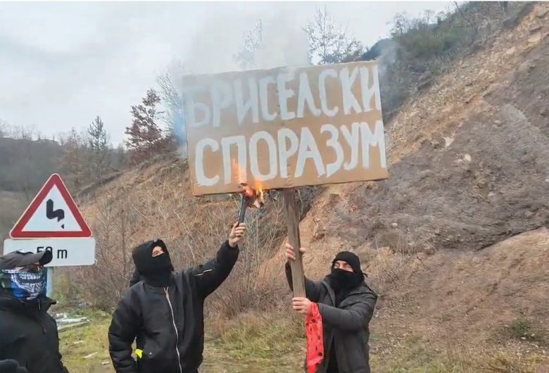 Pankarta me mbishkrimin “Marrëveshja e Brukselit” digjet nga protestuesit serb në Jarinjë