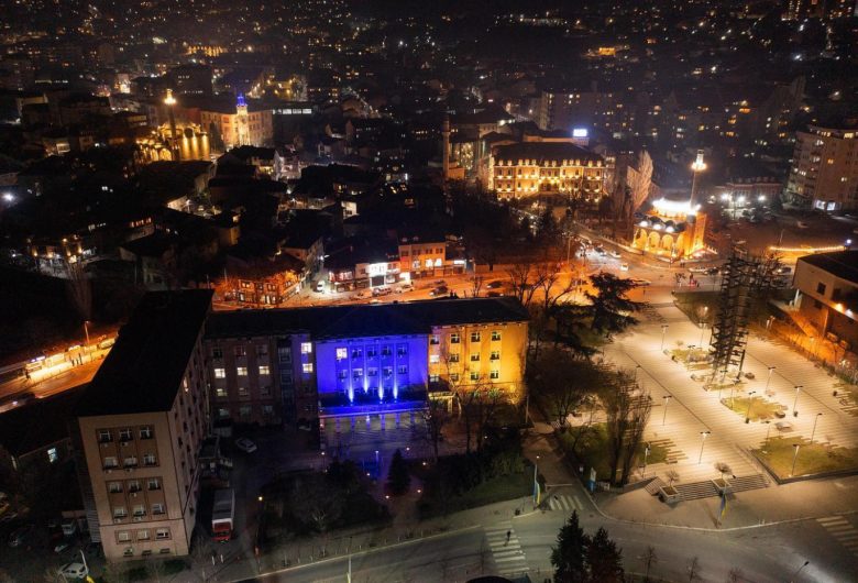 Prishtina ndriqohet me ngjyrën e kaltër dhe të verdhë në shenjë solidarizimi me popullin e...