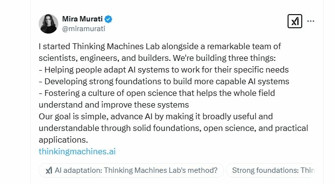 Inxhinierja shqiptare, Mira Murati ka lansuar projektin e saj me inteligjencë artificiale, të quajtur “Thinking Machines Lab”.