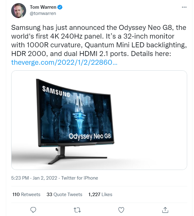 Kompania koreano-jugore thekson se Odyssey Neo G8 i ri i krijuar përdor teknologjinë Quantum Mini LED, Quantum HDR 2000 me një shkëlqim maksimal prej 2000 nits dhe një kontrast statik prej një milion në një.
