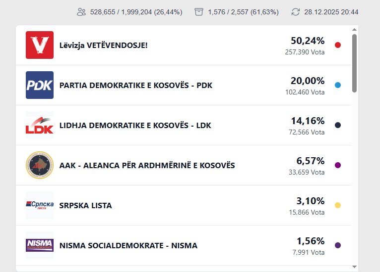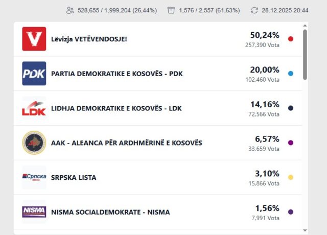 Në bazë të 61.63% votave të numëruara deri më tani, prinë Lëvizja Vetëvendosje me 50.14%, shkruan Arbresh.info.