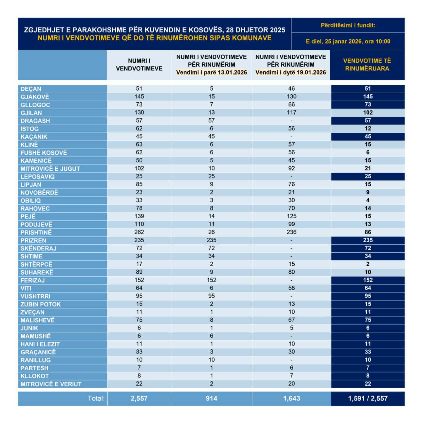 “Nga fillimi i këtij procesi (e martë, 13 janar 2026, ora 18:00) dhe deri më tani (e diel, 25 janar 2026, ora 10:00) janë rinumëruar mbi 62% apo 1,591 nga 2,557 vendvotime”, ka njoftuar Zëdhënësi i KQZ-së, Valmir Elezi.